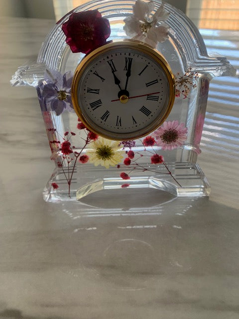 New made to order decorative mantel flower clock. Size 6.1 x 6.3 made with pressed flowers.