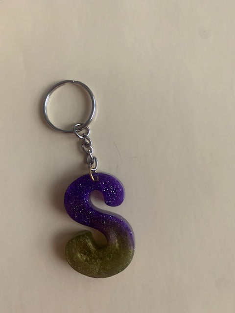 New made to order the letter S UV resin keychain. Color Purple and Gold with sparkle Gold glitter in it. Very pretty.