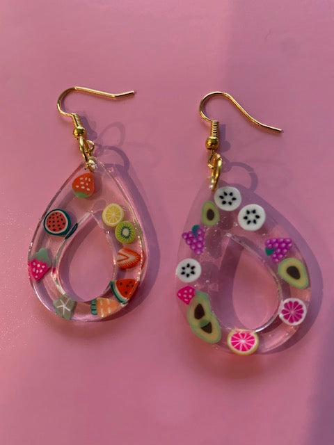 New made to order round end fruit dangle earrings made from uv resin.
